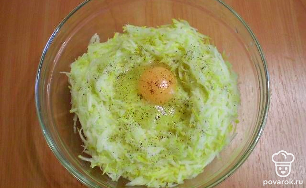 Все овощи почистить, натереть на терке, посолить, оставить на 20 минут, чтобы выпустили сок. Затем отжать. Добавить яйцо.