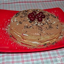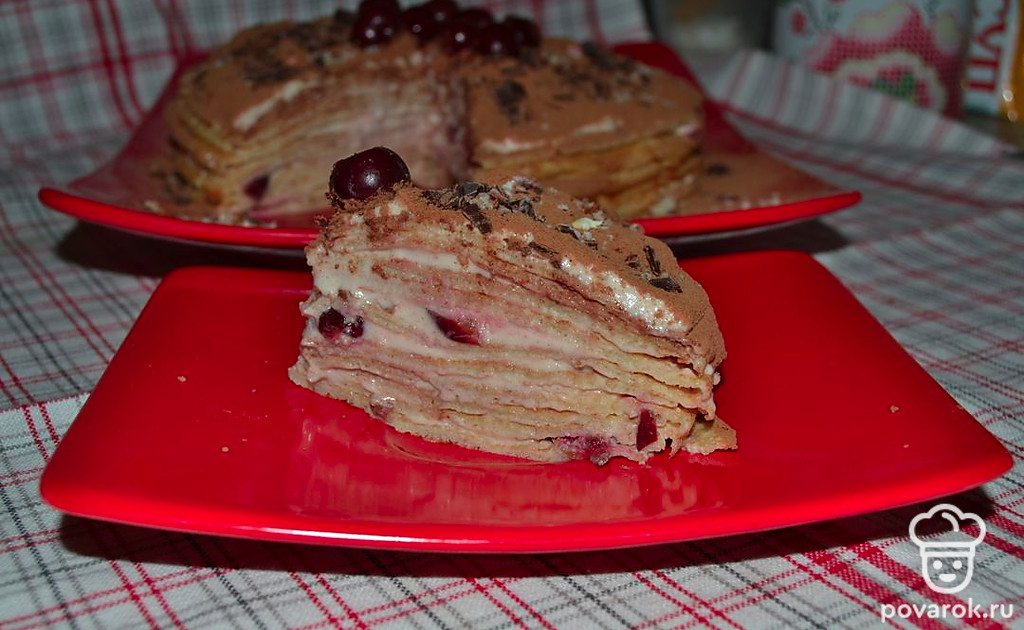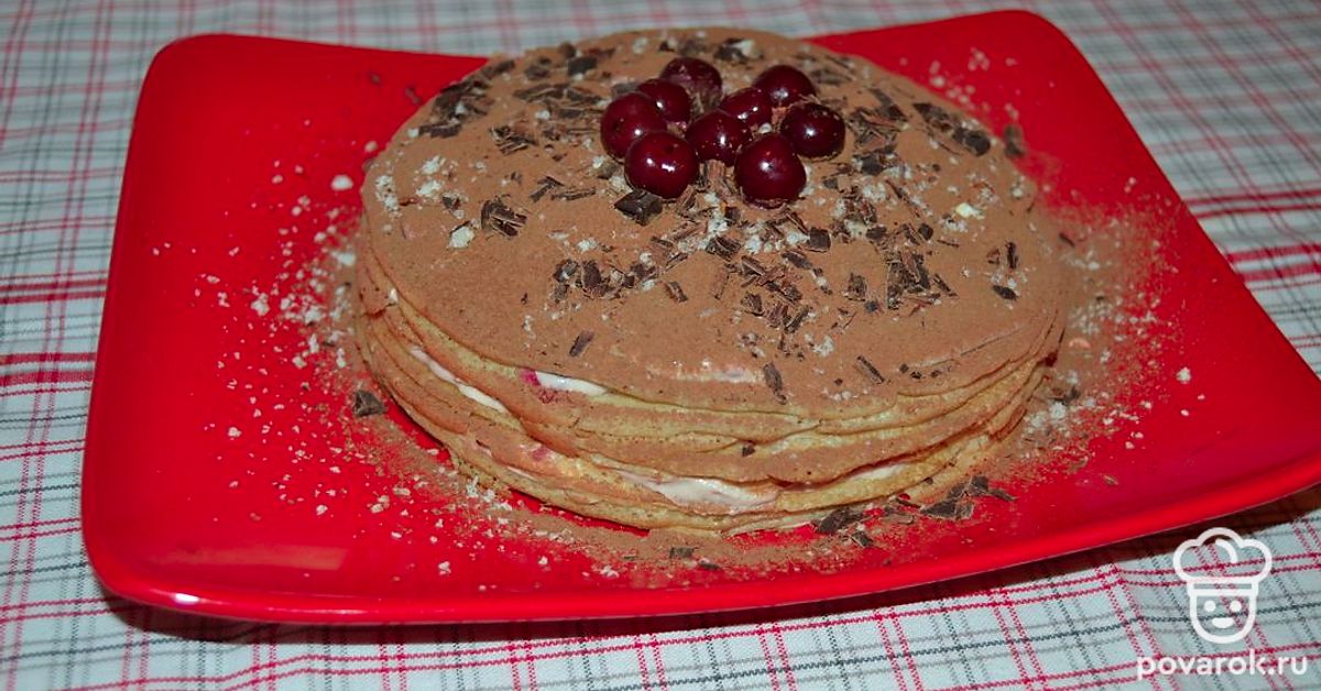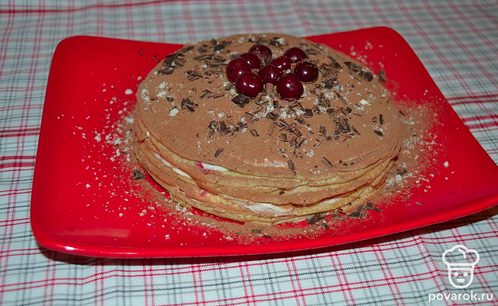 Когда положите последний блин, смажьте верх и бока торта кремом, посыпьте какао (через сито). Украсьте вишней.
