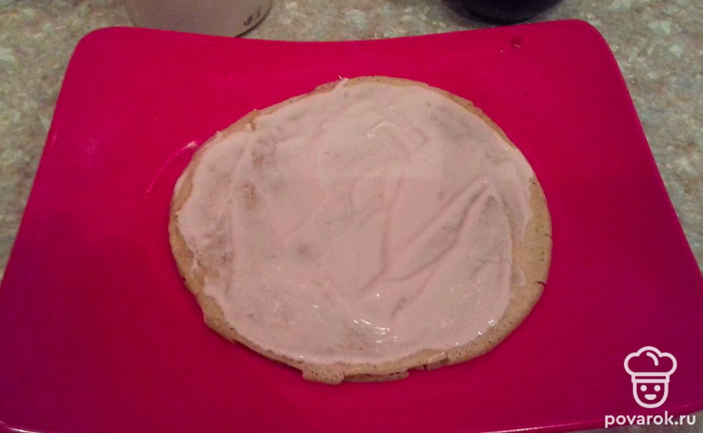 Соберите торт. Выложите блин, полейте кофейной смесью (1-2 ч. л.), дайте впитаться и нанесите крем. Так поступайте с каждым блинчиком.