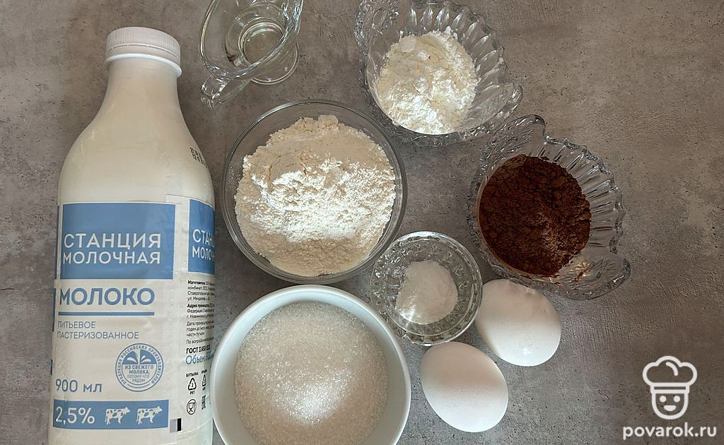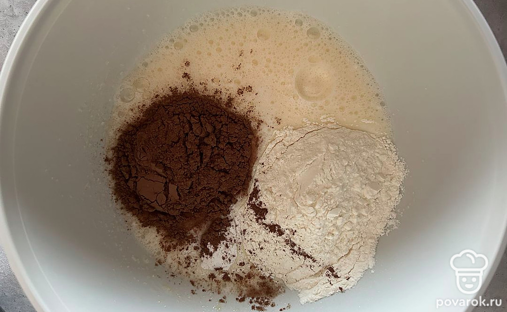 Добавляем 500 миллилитров молока, муку, разрыхлитель, растительное масло и какао-порошок. Все хорошо перемешиваем.