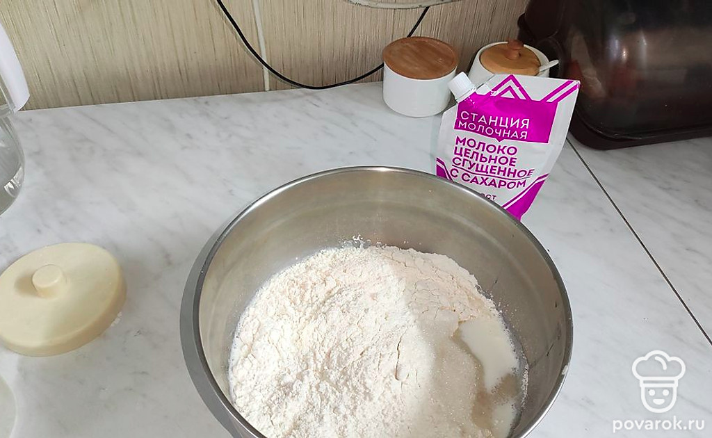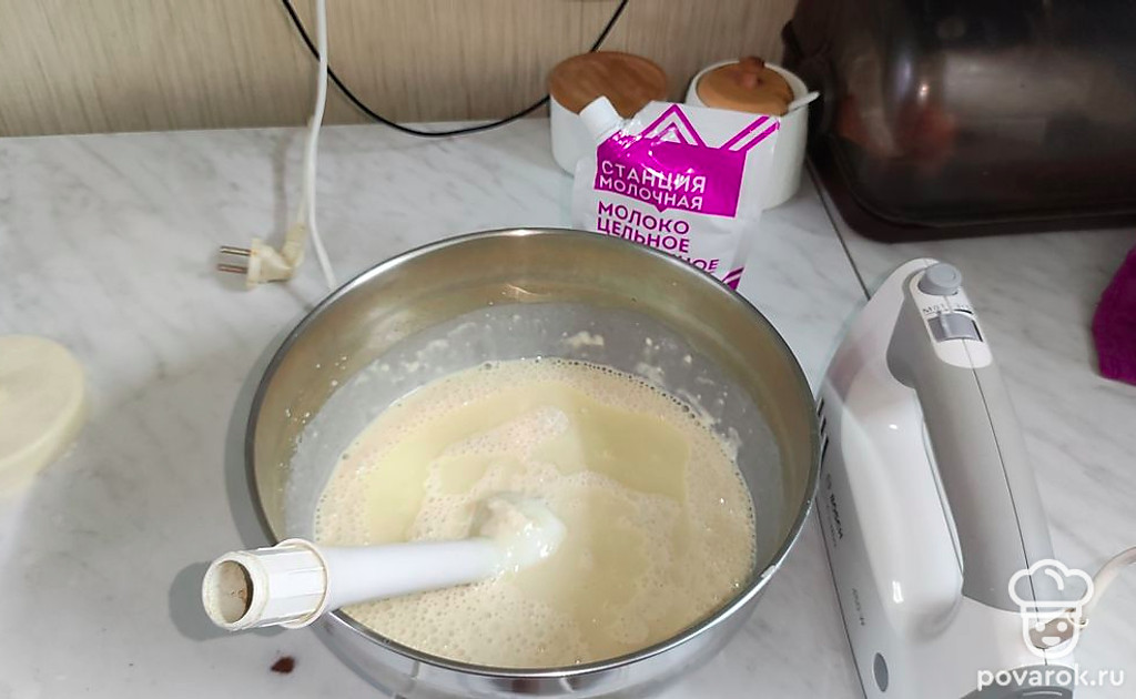 Смешайте яйца молоко, сахар, соль, муку. Взбейте миксером до однородной массы.