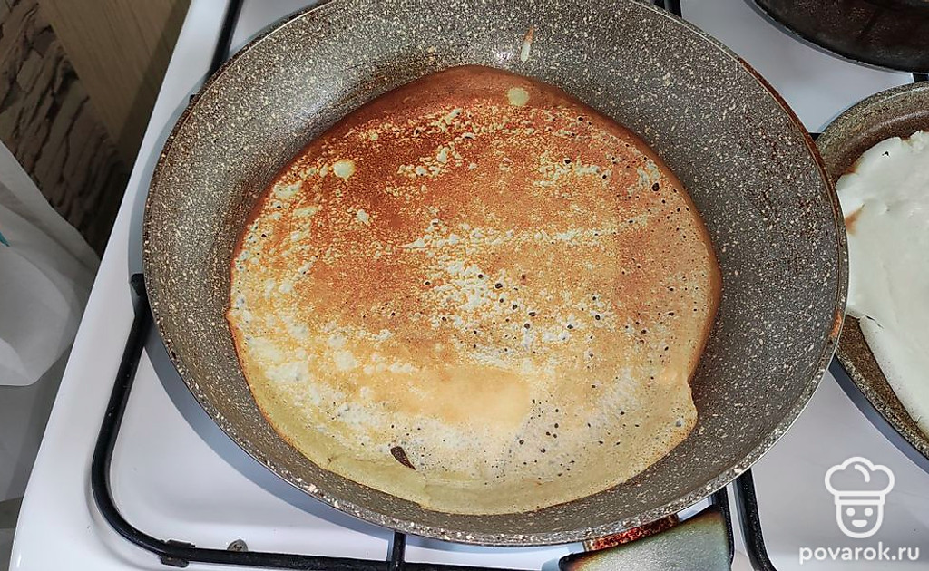 Пожарьте блины из всего теста. Из этого количества теста должно получиться 27-30 блинов.