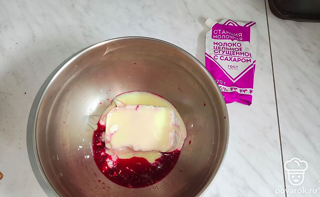 Смешайте творожный сыр со сгущенкой, добавьте сок замороженной вишни. Взбейте крем миксером до однородной массы.