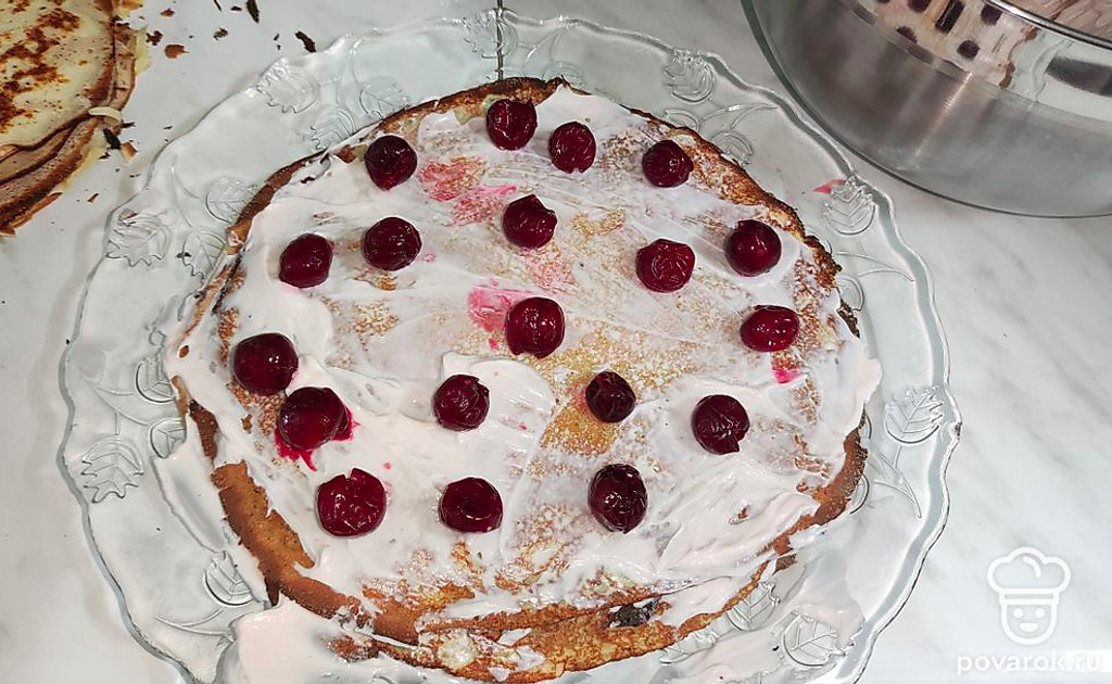 Добавьте ягоды вишни. Соберите торт из всех блинов и крема. Торт отправьте в холодильник на 3 часа пропитаться.