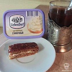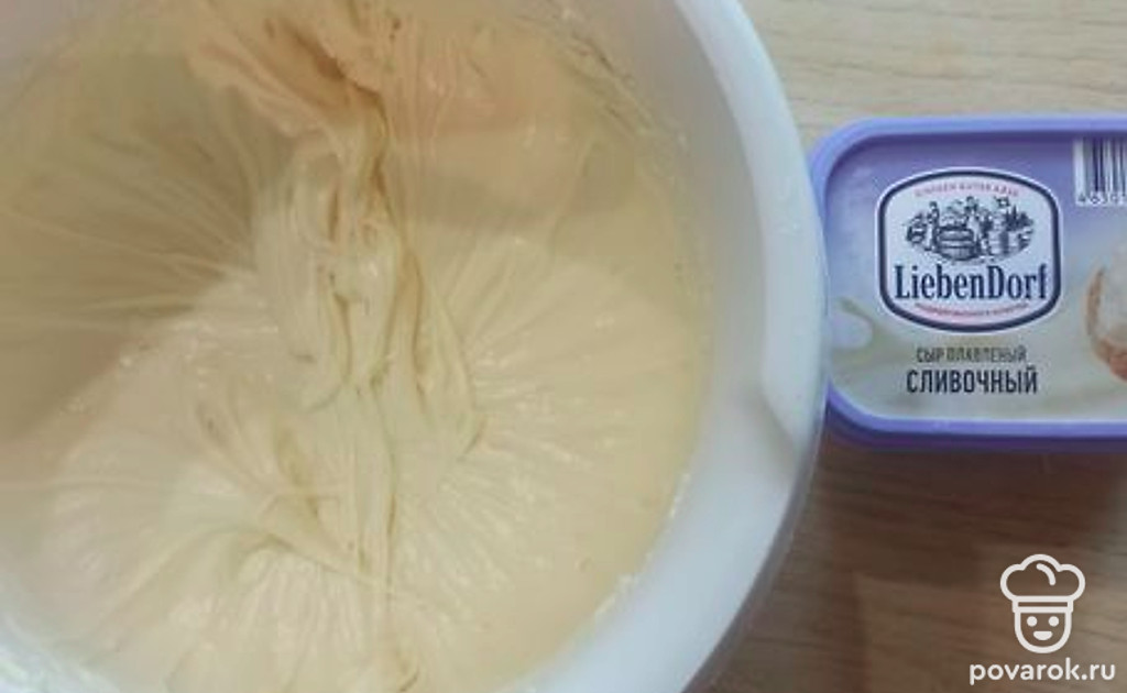 Взбить 200 граммов сливочного сыра, 70 граммов сливочного масла и 100 граммов сахарной пудры.