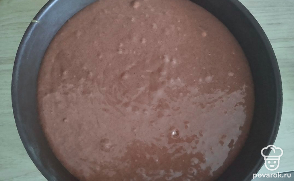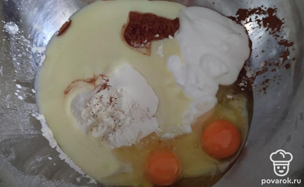 Взбить миксером сгущенное молоко, стакан сахара, разрыхлитель, яйца, 5 столовых ложек какао, сметану, муку.