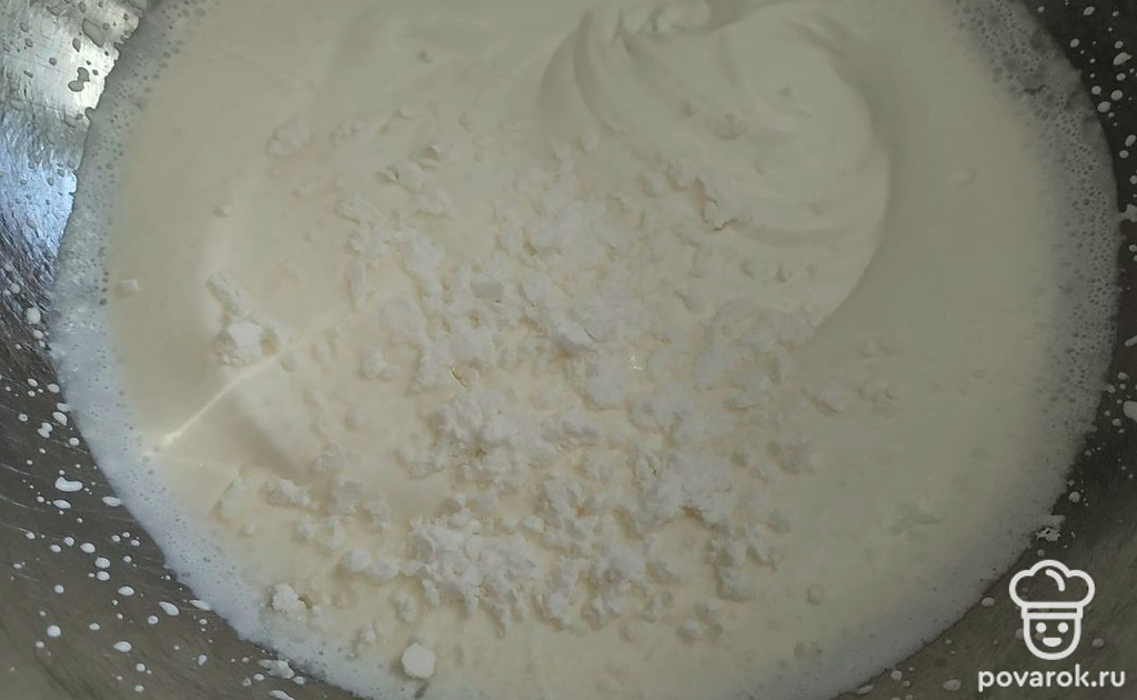 Взбить миксером холодные сливки, добавить сахарную пудру.