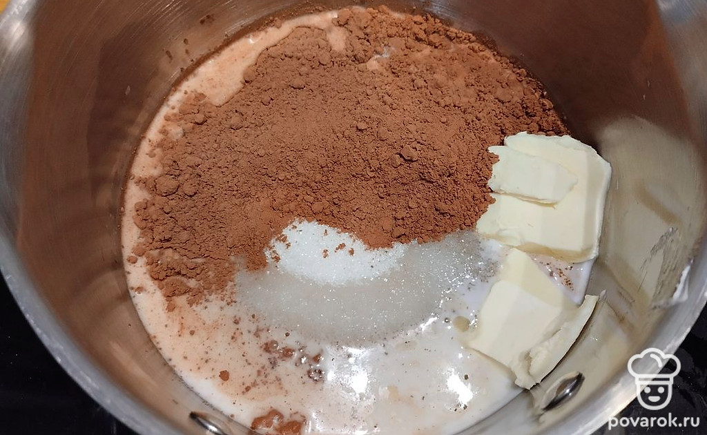 В кастрюле смешать 50 грамм масла, 3 столовые ложки какао, 2 столовые ложки сахара, 70 миллилитров молока. Варить, помешивая, на медленном огне до загустения.