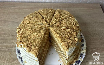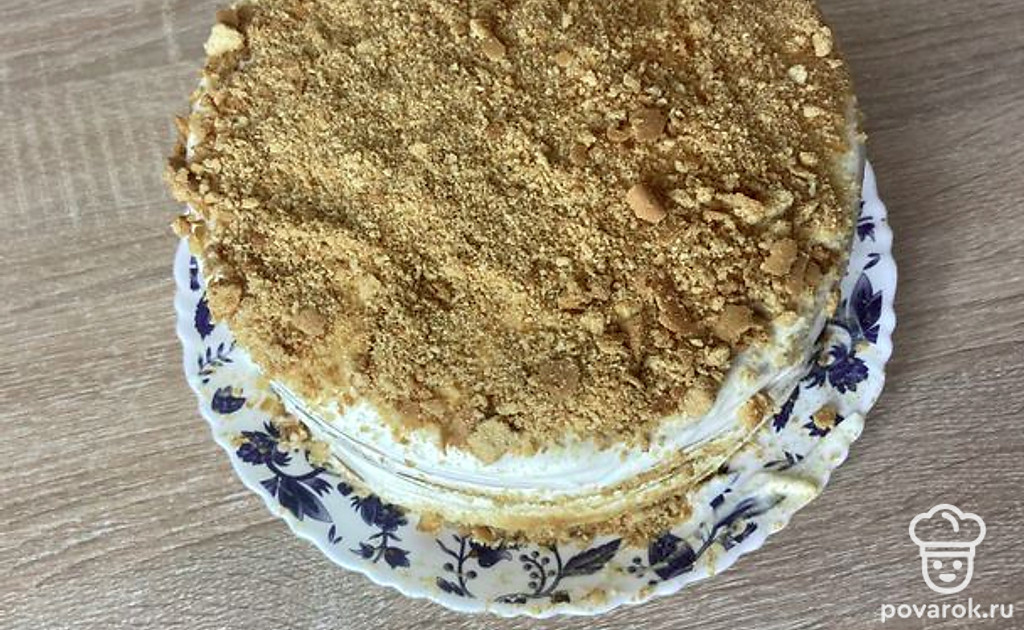 Начинаем собирать торт в кондитерском кольце (можно и без него, но с ним торт будет ровным). Крошим отрезки от коржей, посыпаем ими весь торт или только верх. Отправляем в холодильник на ночь (или на 2-3 часа). Завариваем чай и наслаждаемся. Приятного аппетита!