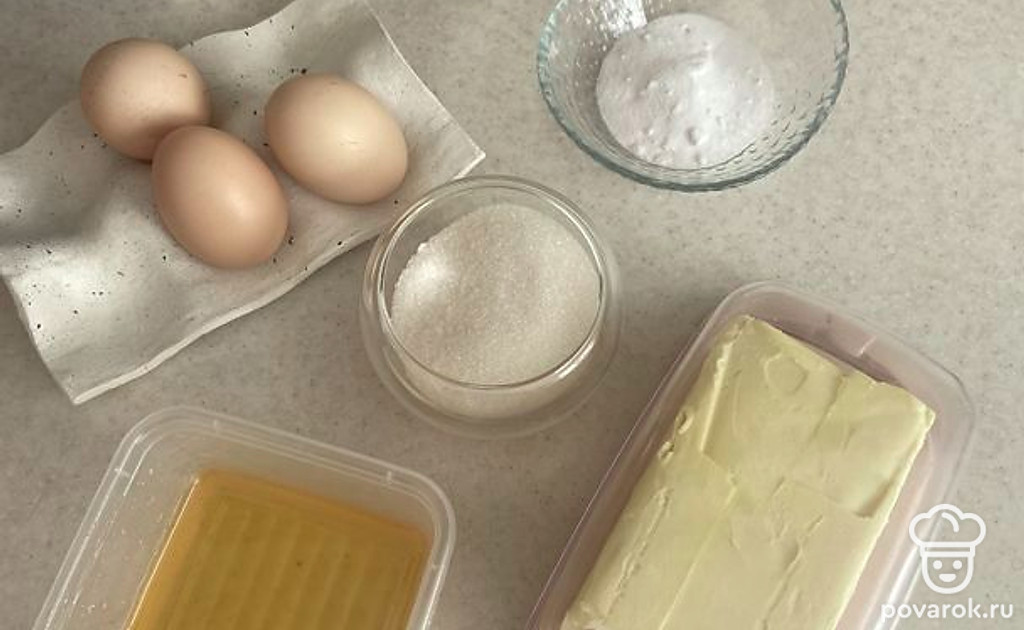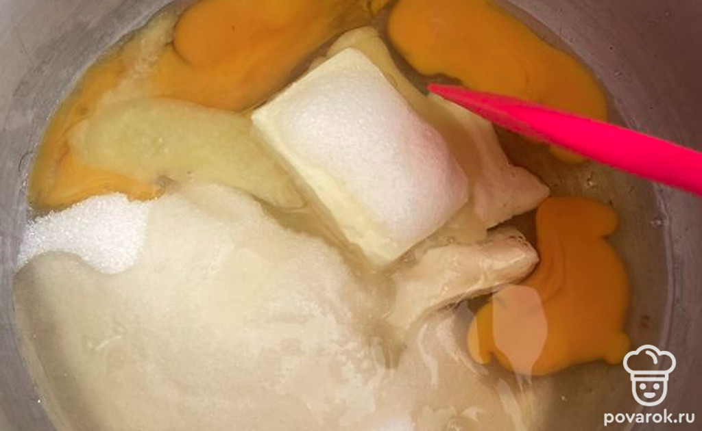 В сотейнике на среднем огне соединяем сливочное масло, сахар, яйца, соду, мед.