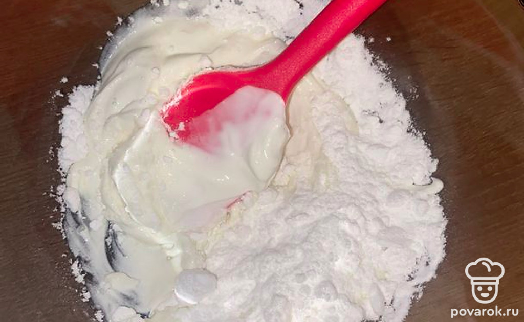 Готовим крем. Сметану и сахарную пудру перемешиваем лопаткой.