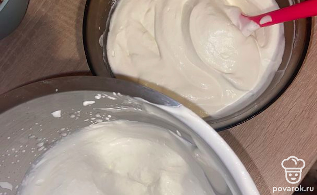 Сливки взбиваем. После объединяем сливки с массой и перемешай лопаткой.