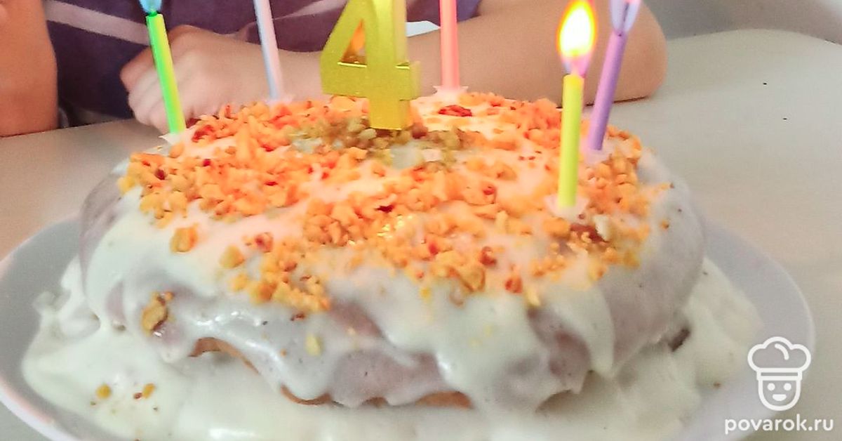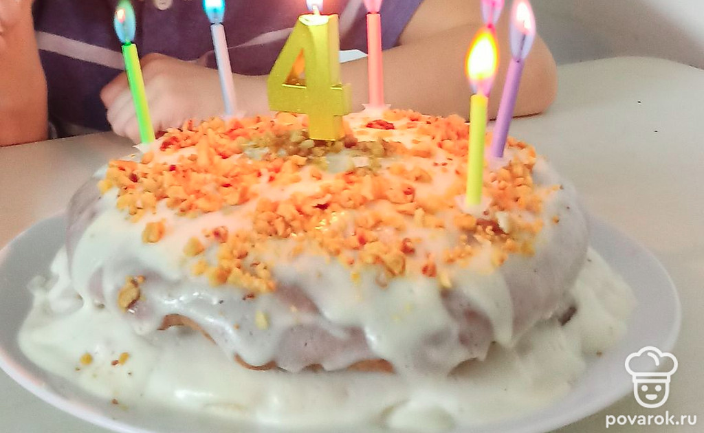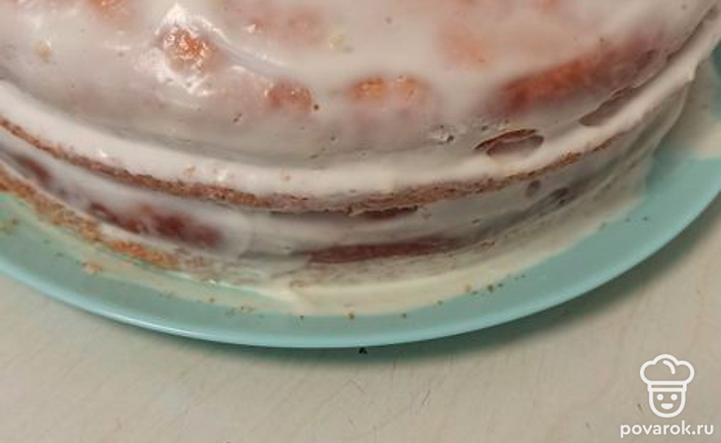 Выкладываем в форму и отправляем на 40минут в духовку при 180 градусах. Даем остыть. Разрезаем на 2 части. Крем: сметану смешиваем с сахарной пудрой. Промазываем слои. Даем пропитаться.