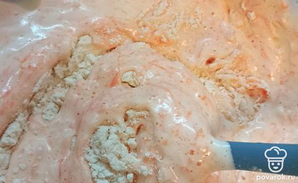 Затем вводим разрыхлитель и муку. Тоже аккуратно мешаем.