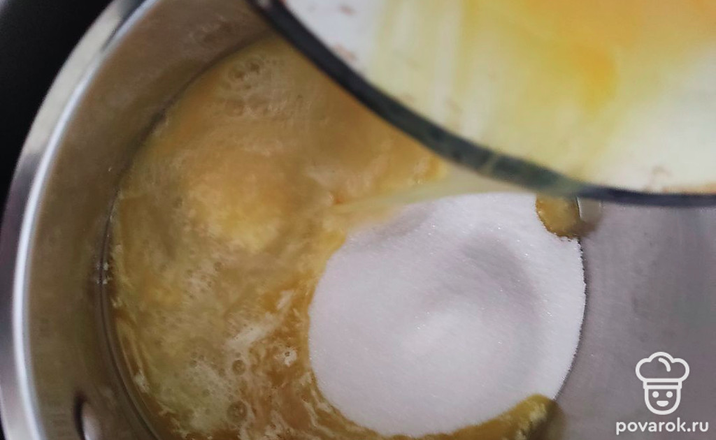 На водяной бане растопить сливочное масло с медом, добавить сахар и слегка взбитые яйца. Помешивать, чтобы яйца не свернулись. Добавить соду, соль и водку.