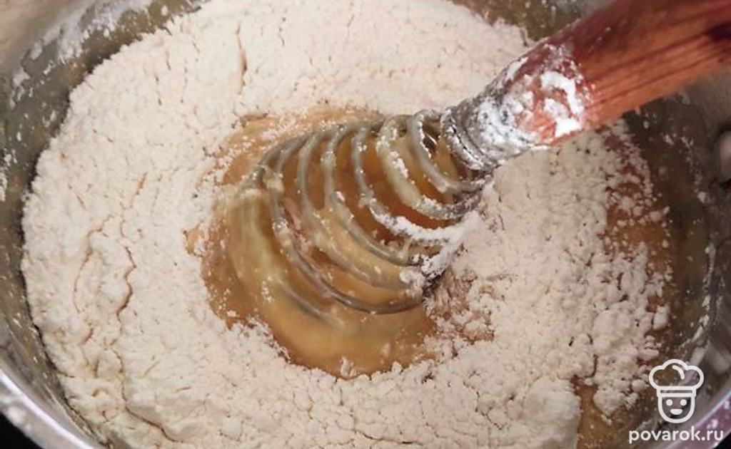 Размешать все, не снимая с водяной бани, досыпать два стакана муки. Прогреть около 5 минут.