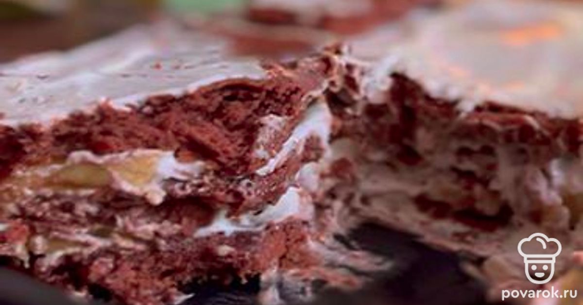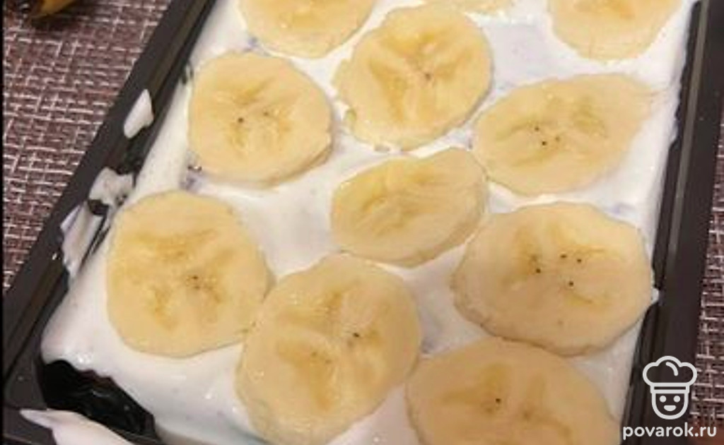 Смазываем его сметаной и распределяем нарезанные бананы.