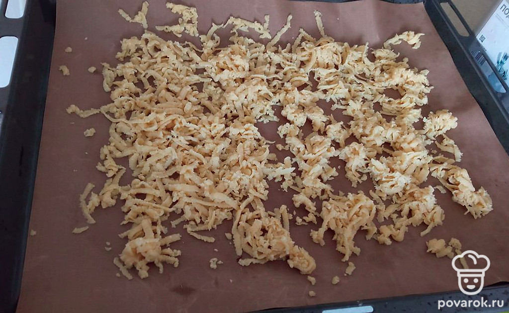 Замороженное тесто натираем на терке на противень. Запекаем при температуре 180 градусов 7-10 минут.