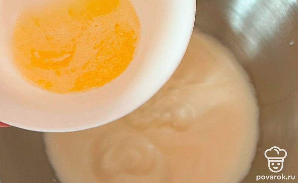 Добавляем в полученную воздушную массу растопленное, но не горячее сливочное масло.