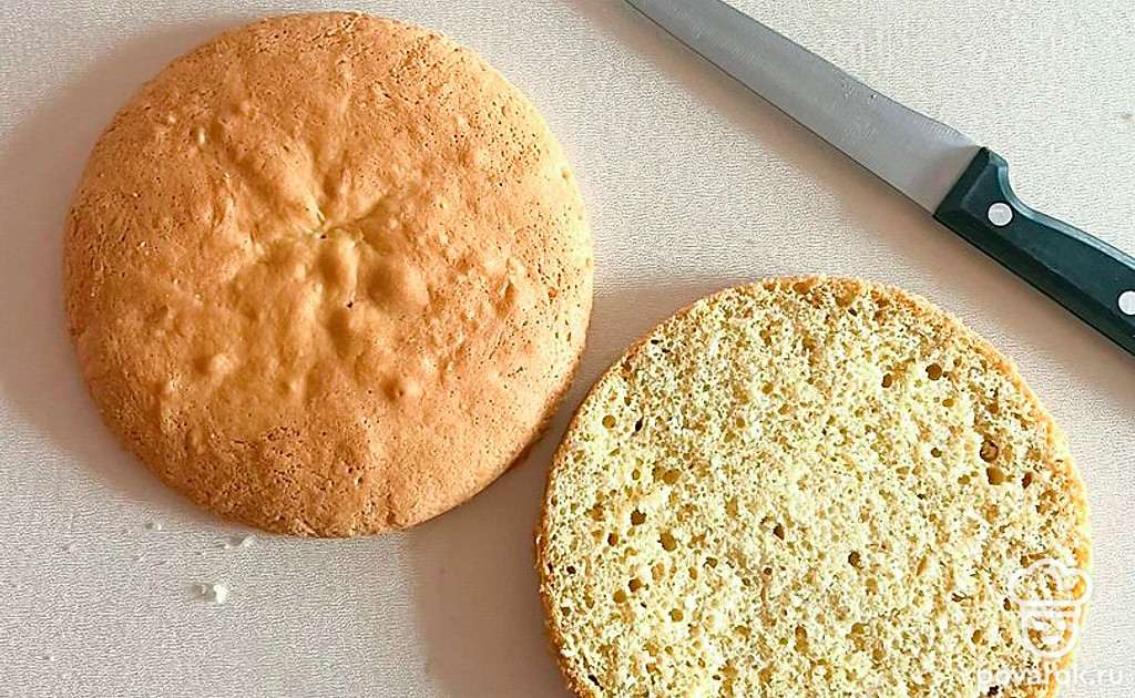 Готовый бисквит заворачиваем в пищевую пленку и отправляем на пару часов в холодильник. Затем достаем и разрезаем корж пополам.