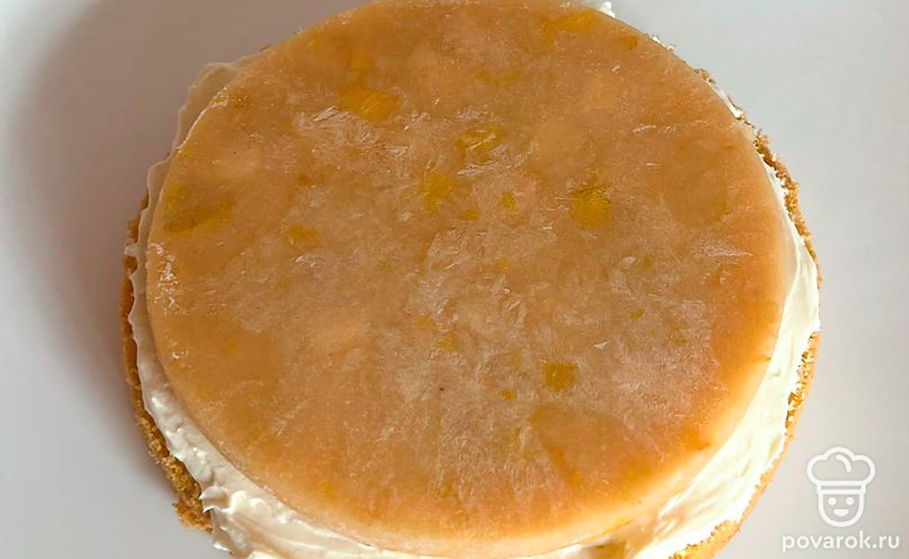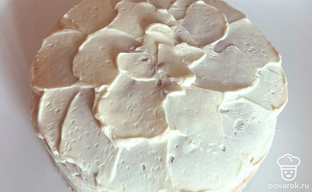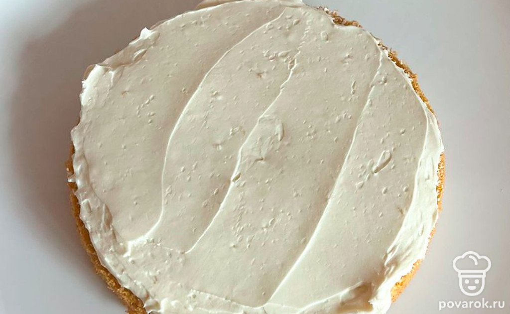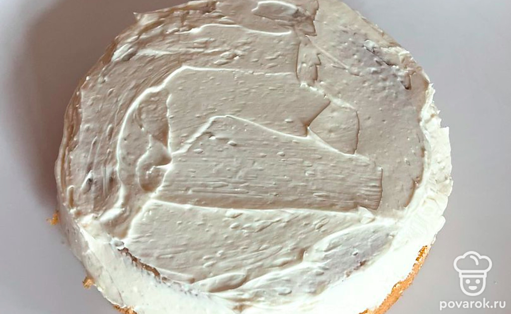 Обмазываем ее сверху кремом и кладем верхний корж.