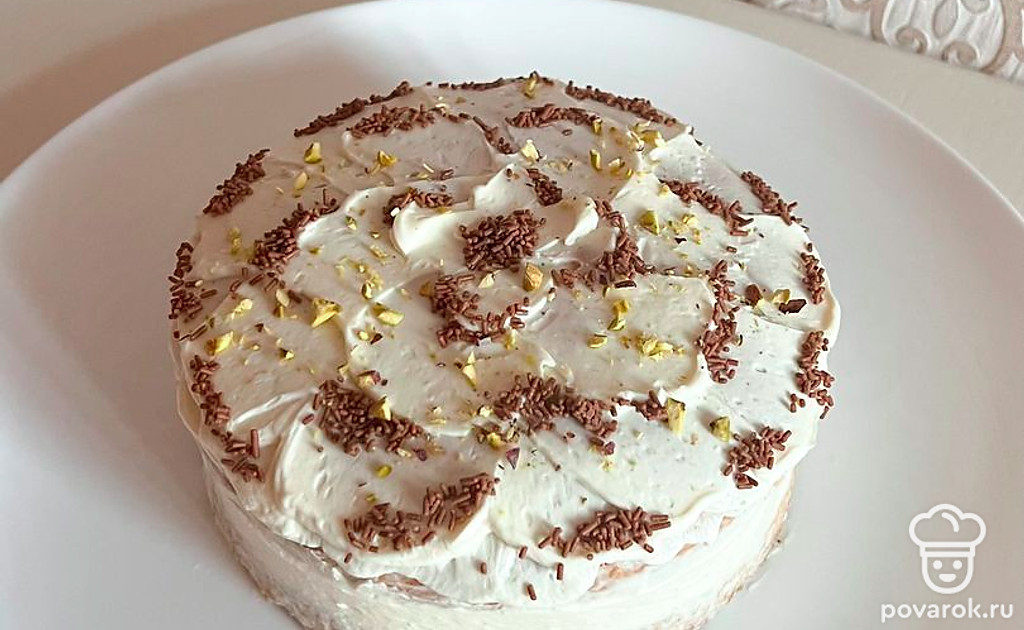 Можно украсить торт миндальными лепестками и шоколадной крошкой.