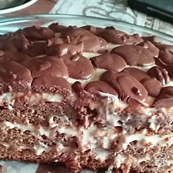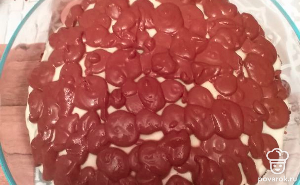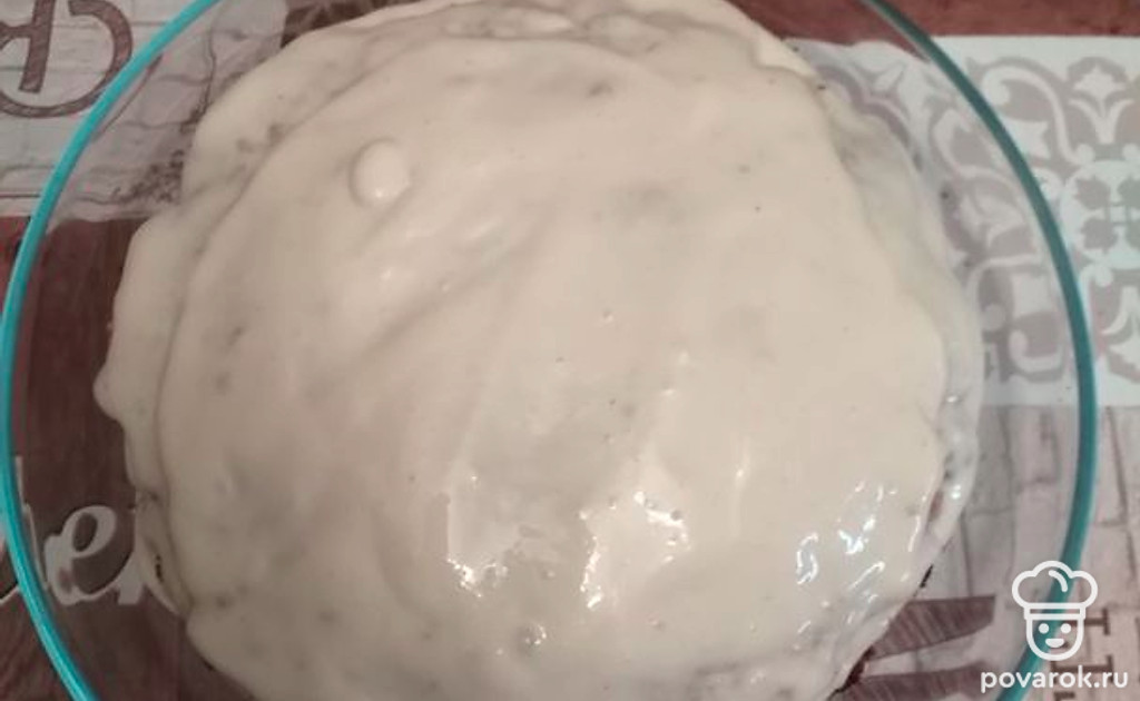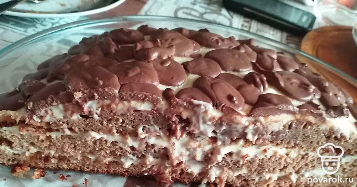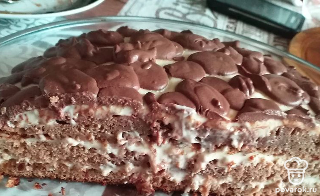 Смазать каждую пышку охлажденным кремом, собрать торт. Сверху полить растопленым шоколадом.