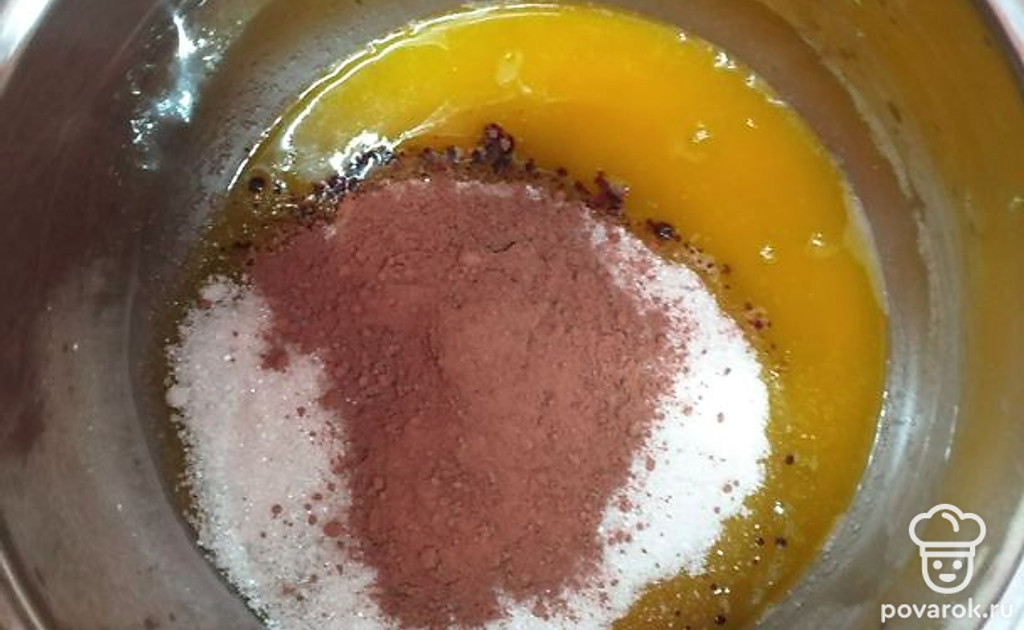Масло растопить. Добавить яйца, какао, разрыхлитель, муку, сахар. Все хорошо вымесить.