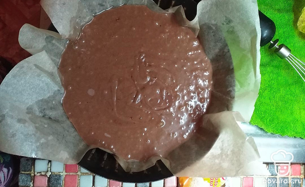 Вылить в форму, застеленную пекарской бумагой и выпекать 30 минут в разогретой духовке, до готовности.