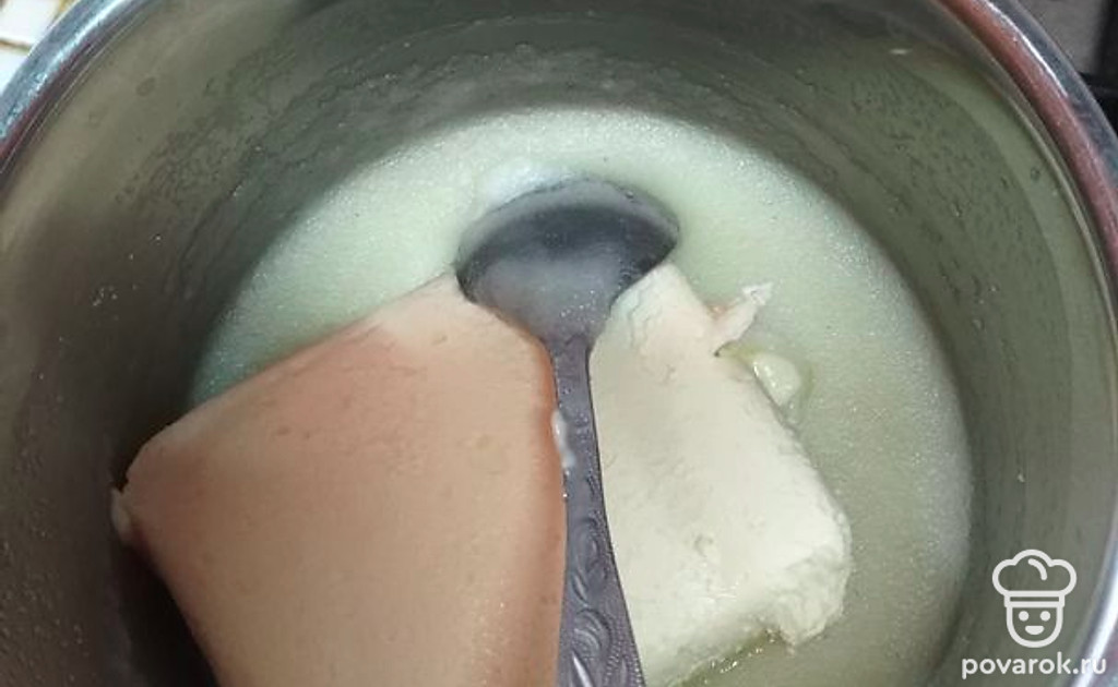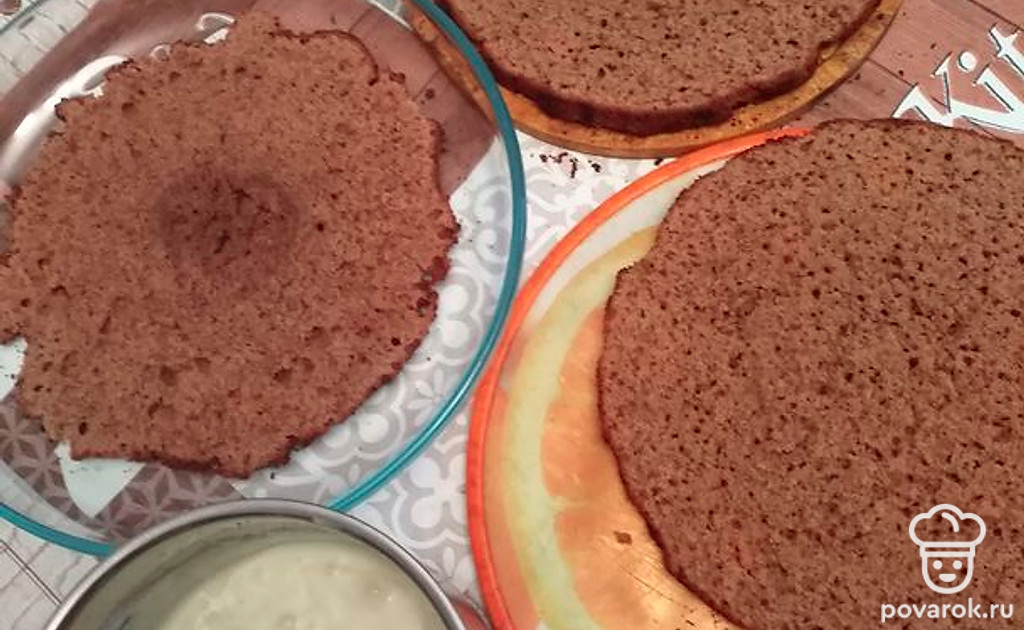 Приготовить крем. Сварить густую сладкую манную кашу: смешать 0,5 литра молока, 5 столовых ложки манки, 1 стакан сахара и 200 грамм сливочного масла.