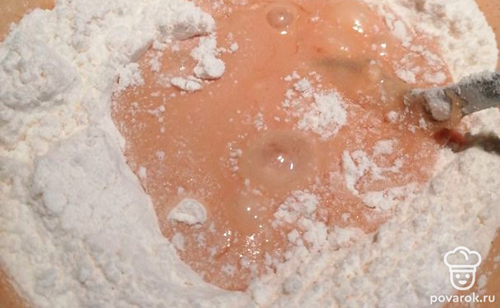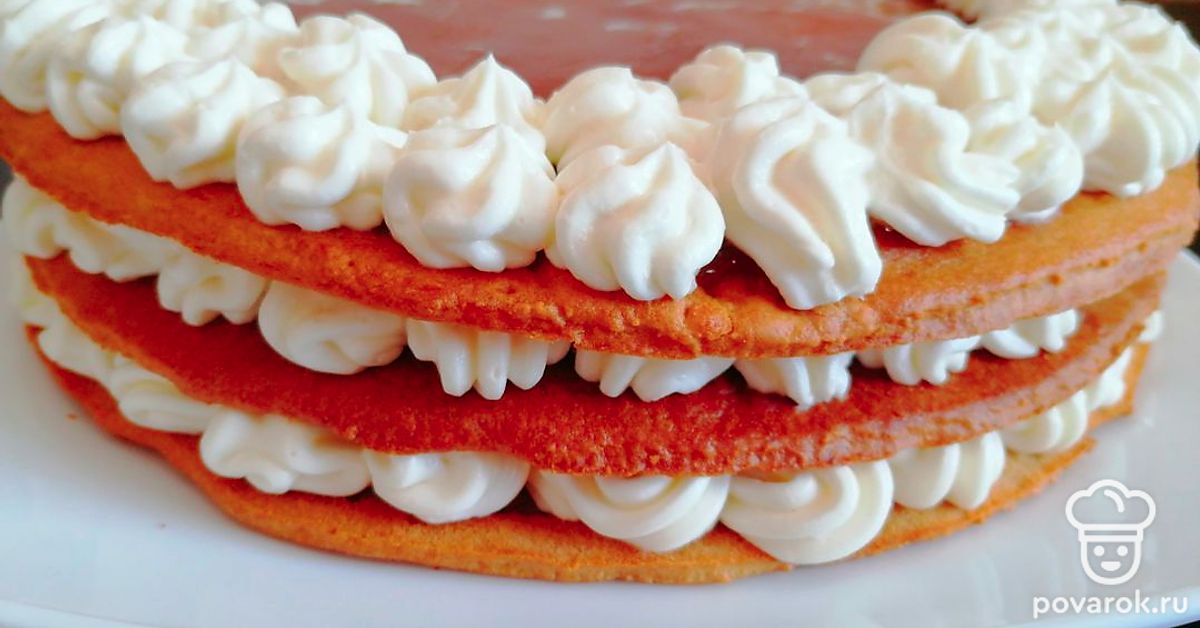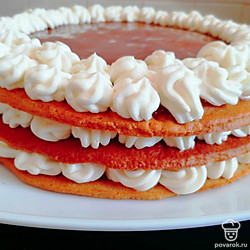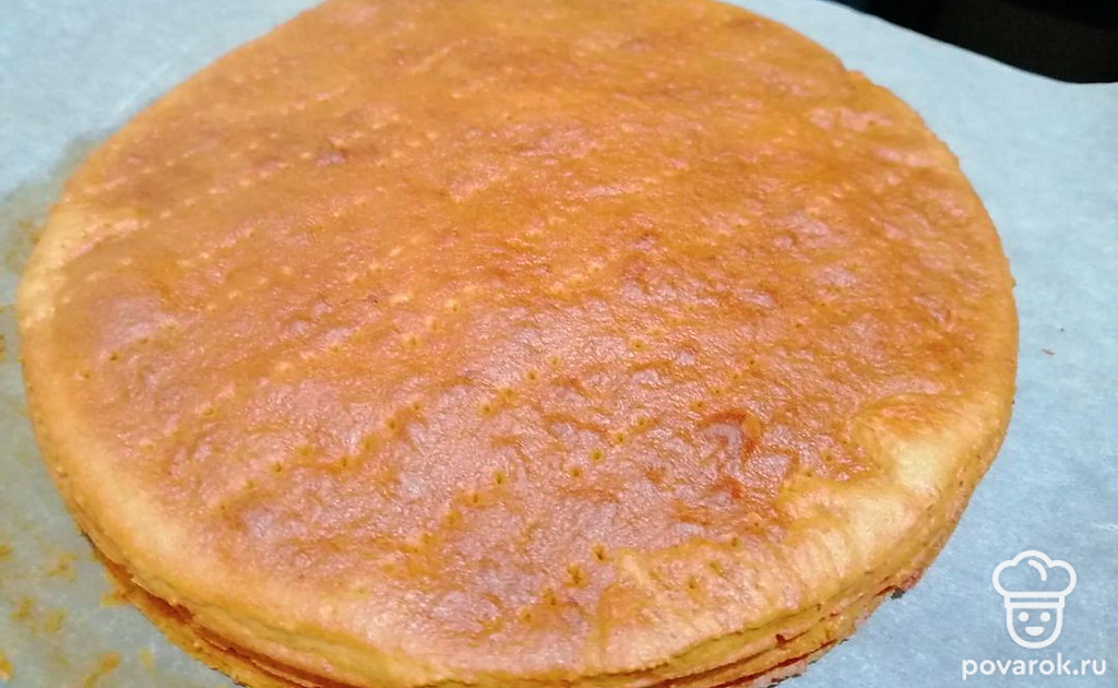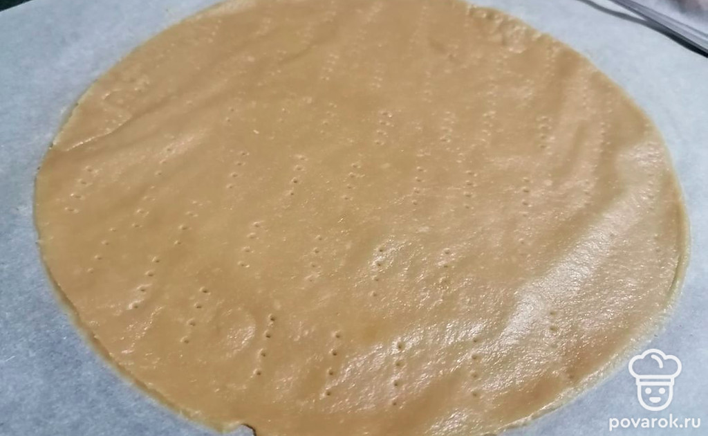 Раскатать 3 тонких круглых коржа на пергаменте, сделать проколы вилкой.
