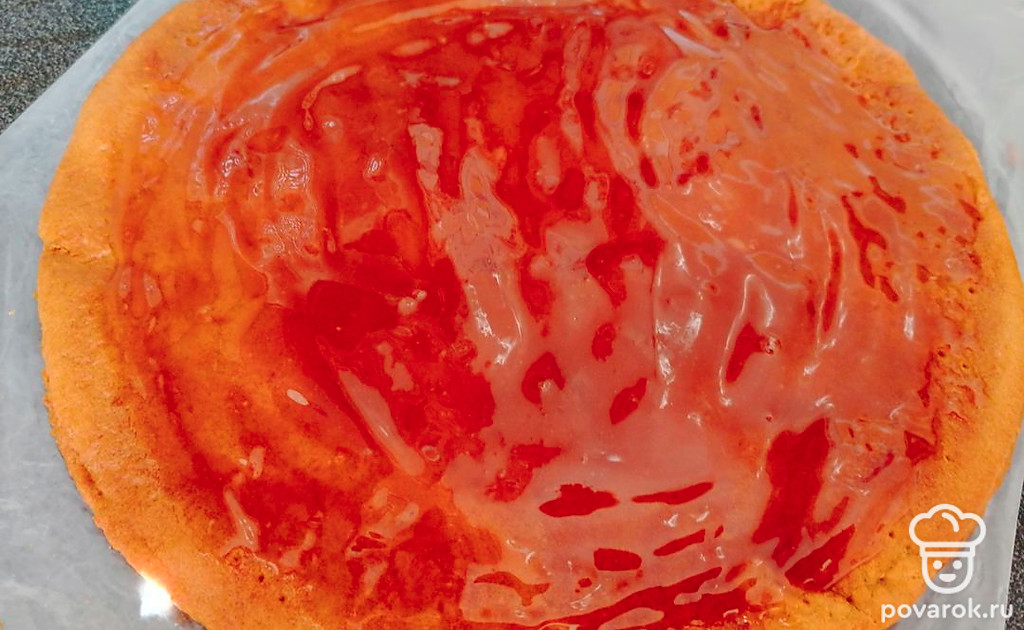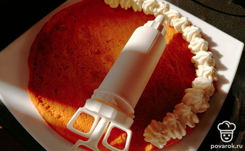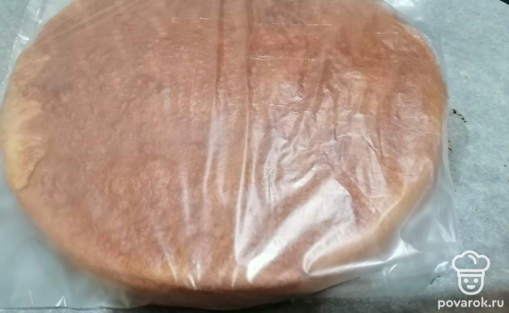 Остывший корж обернуть плёнкой или положить в пакет и поместить в холодильник на пару часов.