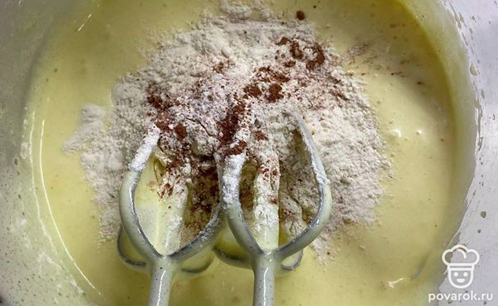 Затем добавляем туда же постепенно муку с какао.