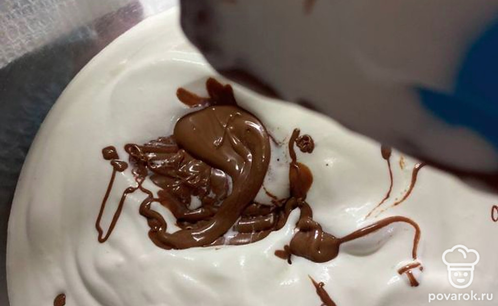 Затем в сгущенку вливаем взбитые сливки и туда же растопленный шоколад. Взбиваем до однородной консистенции.