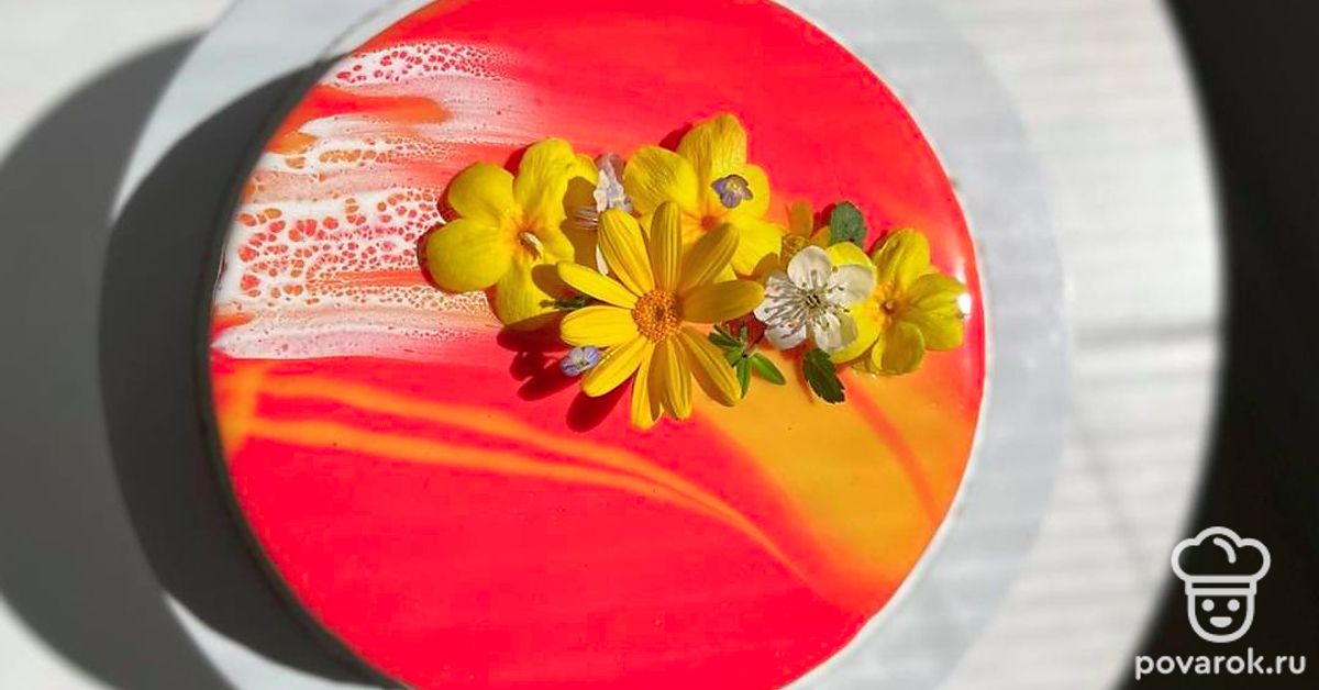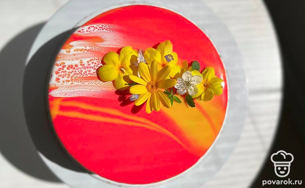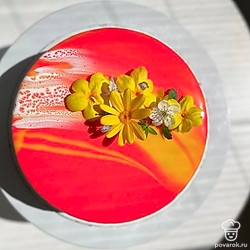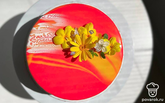 Чтобы сделать леопардовый эффект сверху, смешайте 1 ч.л. нейтрального кондитерского геля и белый краситель (диоксид титана), разогрейте в микроволновке в течение 10 секунд, нанесите на лопатку и проведите сверху по зеркальной глазури сразу после ее нанесения на торт.