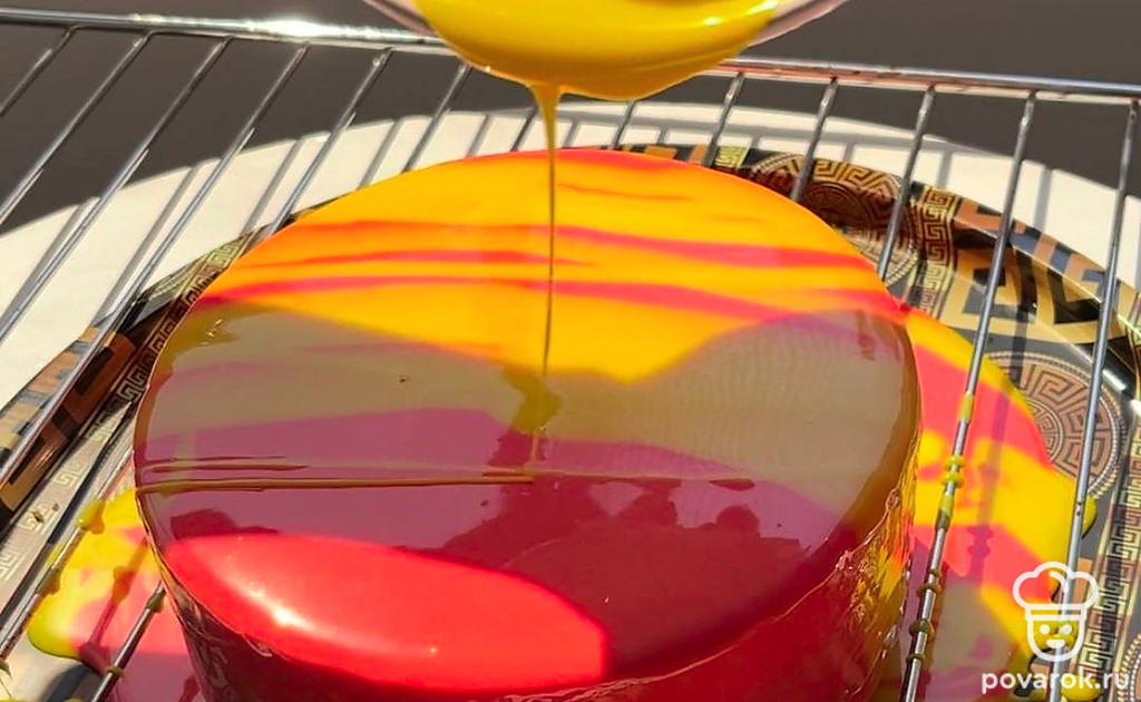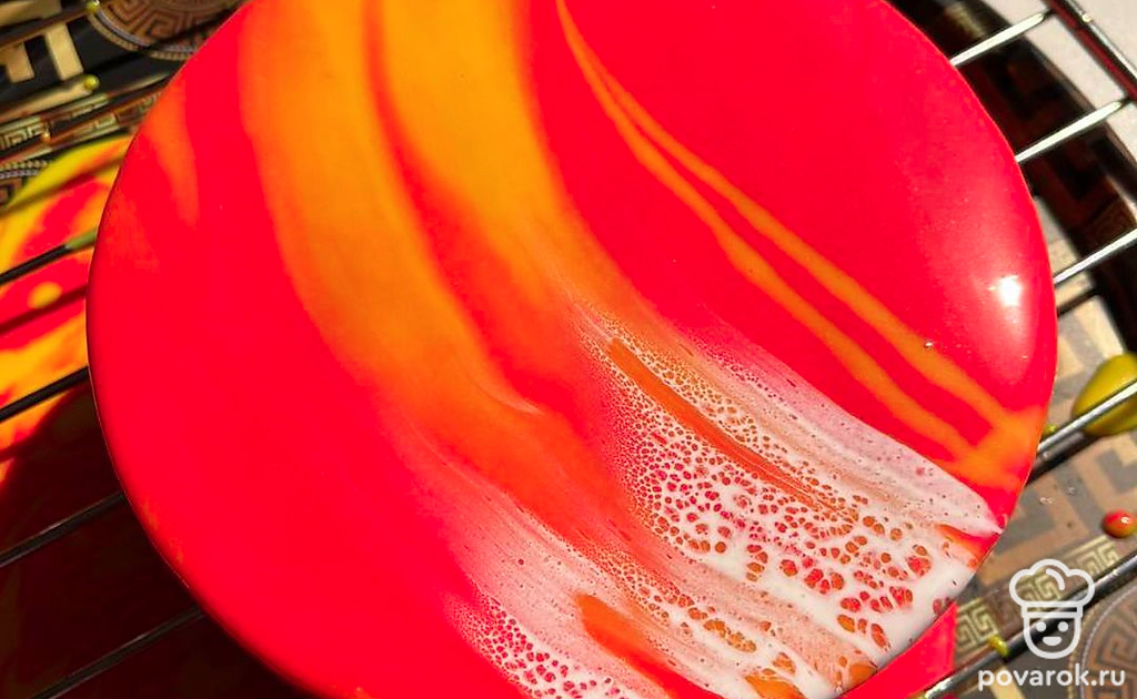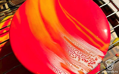 Нанесите глазурь на ледяной муссовый торт или пирожное, уберите излишки лопаткой.