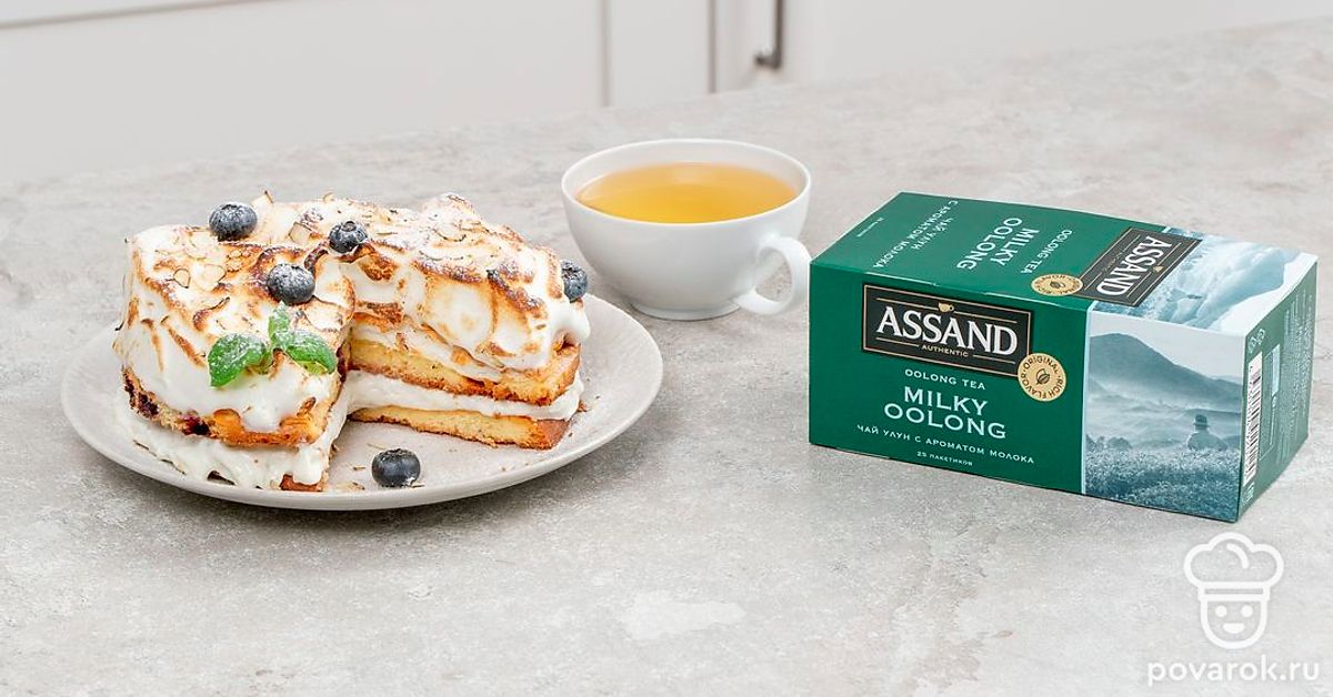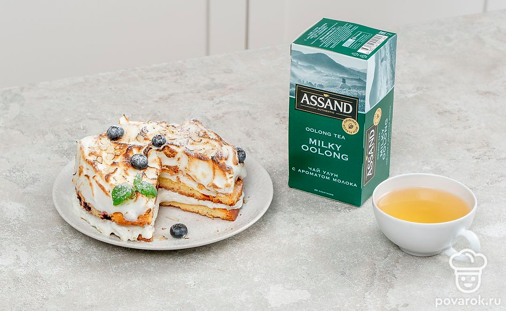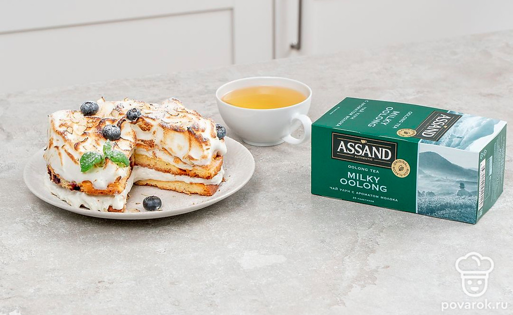 Этот красивый торт сочетает в себе нежный крем и хрустящую меренгу. Десерт дополнен легким привкусом жареного миндаля с добавлением ягод и джема из голубики. Идеальный торт для уютного вечера с чашечкой ароматного крепкого чая.