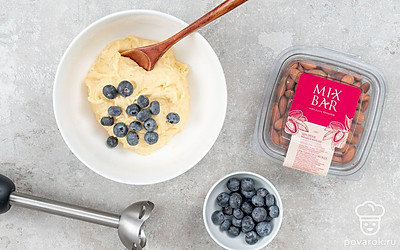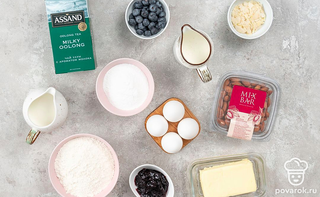 Для приготовления теста для коржей смешайте в блендере до кремообразного состояния масло и сахарную пудру. Слегка взбейте 2 яйца и 2 яичных желтка, влейте к маслу и перемешайте. Влейте 2 ст.л. молока. Всыптье муку небольшими порциями, не переставая перемешивать. Измельчите в мелкую крошку миндаль, добавьте в тесто и перемешайте. Добавьте ⅔ голубики и остатки молока. Аккуратно перемешайте ложкой.