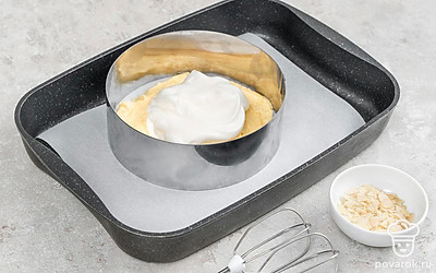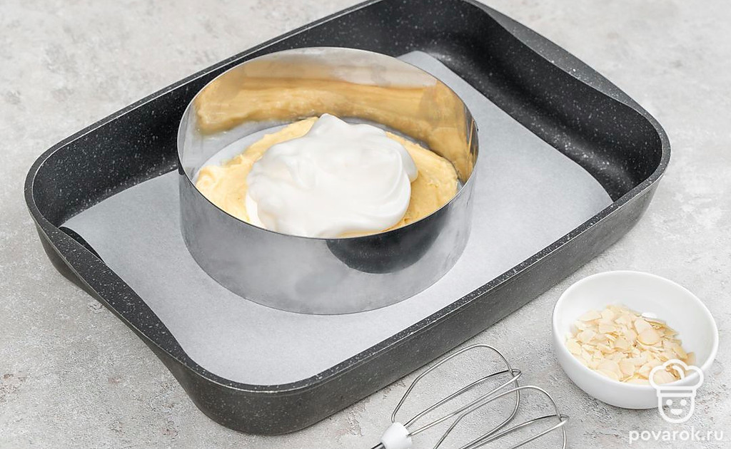 Разделите тесто на две части и распределите по формам, разровняйте лопаткой или ложкой. Взбейте 2 яичных белка, добавляя по ложке сахарную пудру, не переставая взбивать. Добейтесь устойчивых пиков и выложите поверх теста в одной из форм. Посыпьте взбитый белок миндальными хлопьями.