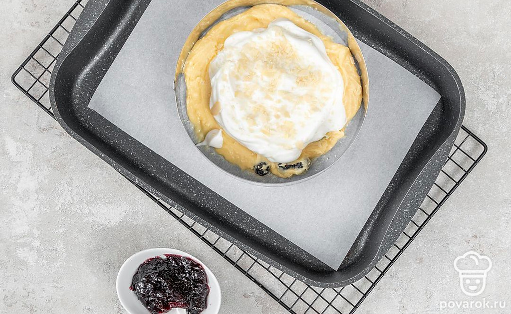 Разогрейте духовку до 160°C. Отправьте обе формы с коржами в духовку. Через 40 минут достаньте корж без меренги из духового шкафа. Корж с меренгой выпекайте еще 30 минут. Остудите. Взбейте сливки и выложите на корж без безе. Промажьте джемом из голубики. Сверху положите второй корж, украсьте оставшимися ягодами.
