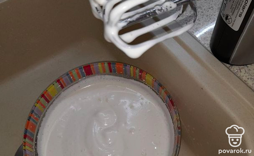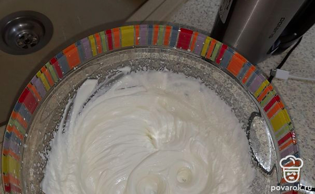 Взбить 4 яйца и 120 грамм сахара в густую пену.