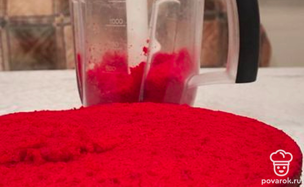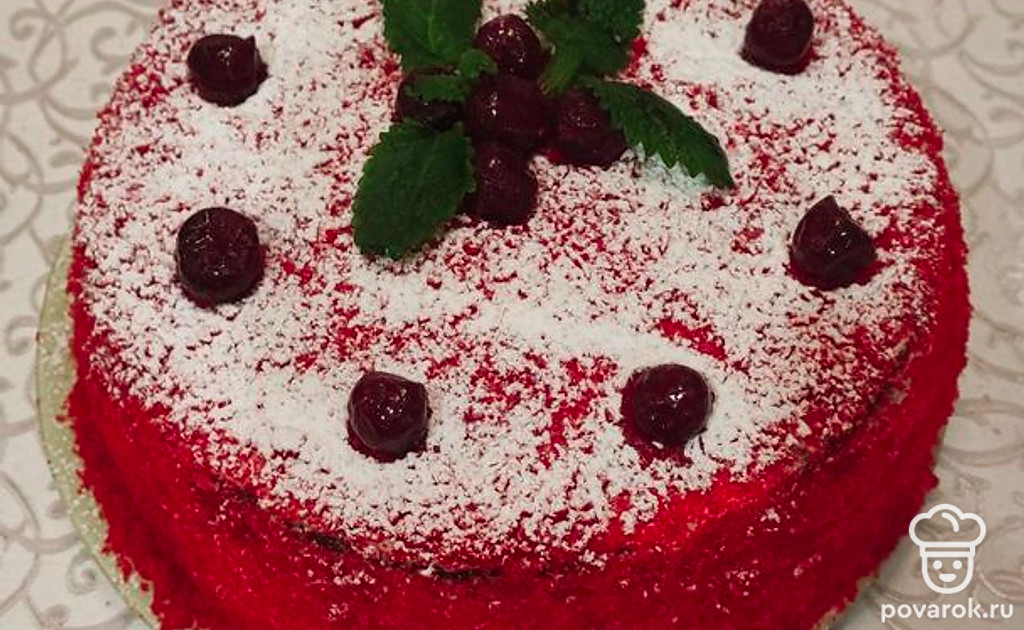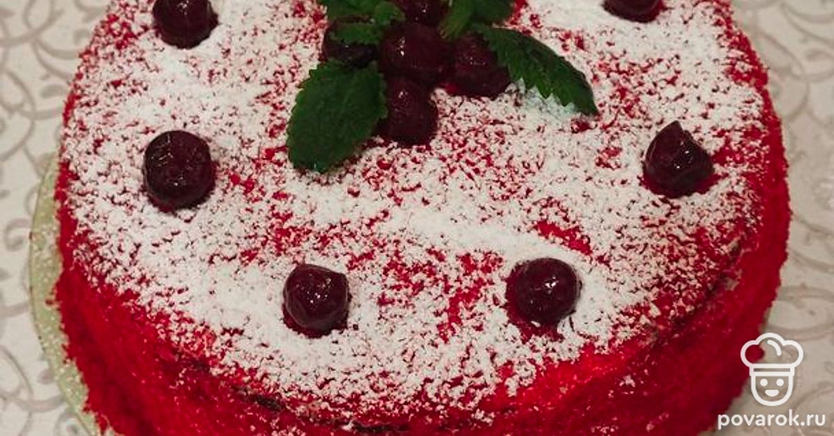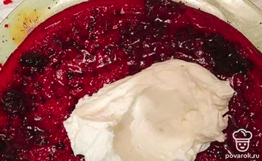 Пропитываем бисквит вишневым вареньем, а сверху выкладываем крем. Так делаем с остальными коржами.