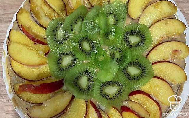 Украсить торт фруктами, ягодами.
