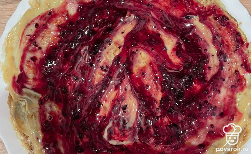 В некоторые слои добавить варенье, повторять все действия до окончания ингредиентов.