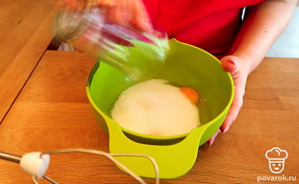 В отдельной миске смешиваем 2 яйца и 160 гр сахара. Хорошенько взбиваем.