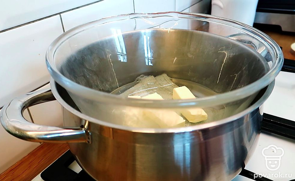 Делаем водяную баню и отправляем на нее растапливать 100 гр. сливочного масла.