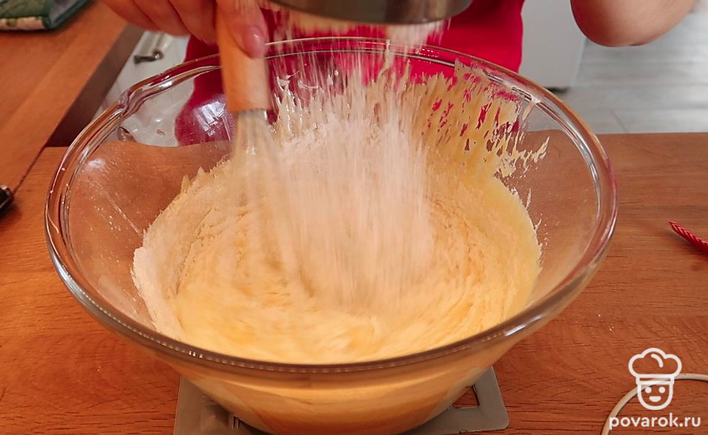 Снимаем массу с огня и начинаем вводить муку. Замешиваем тесто.