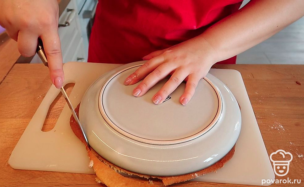 Печем 6 коржей. Каждому даем остыть и вырезаем из них круг, прикладывая тарелку.