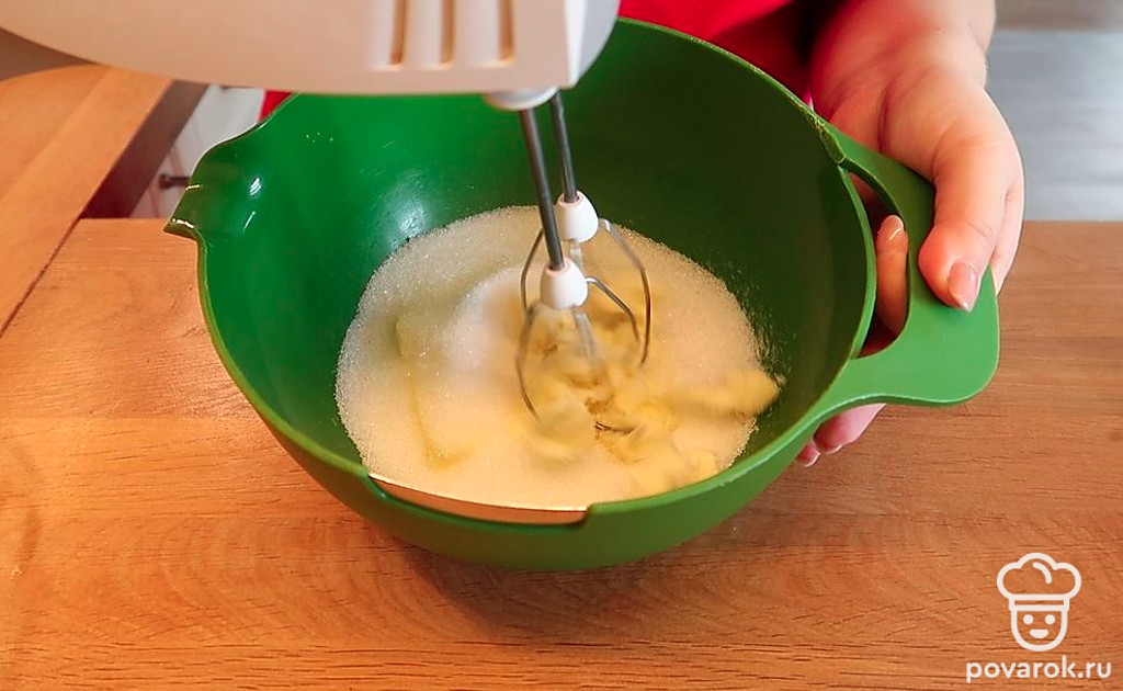 Делаем крем. Для этого смешиваем сливочное масло с сахаром. Хорошенько взбиваем.