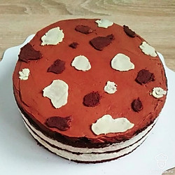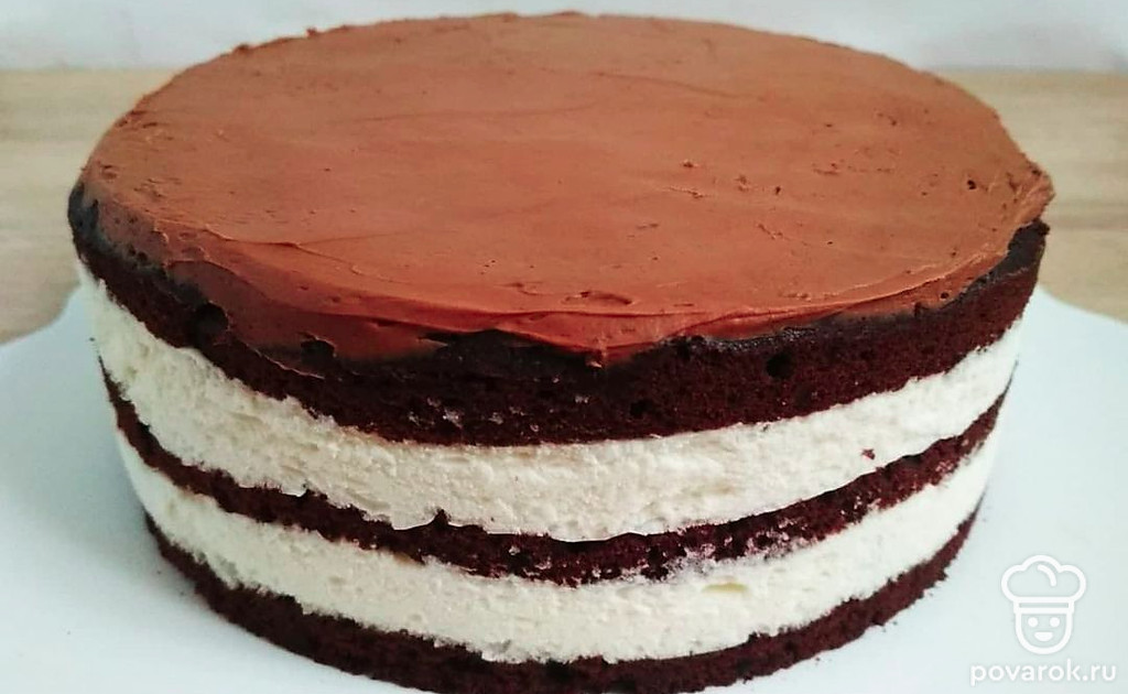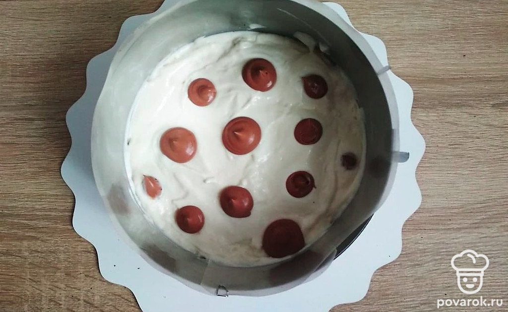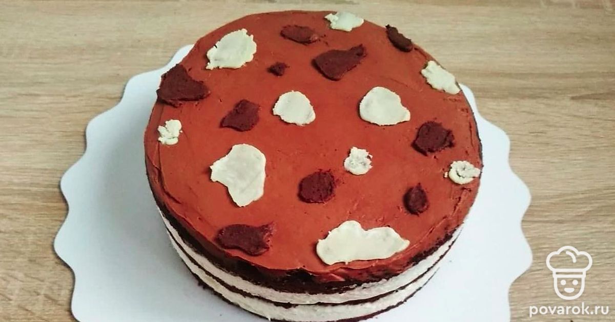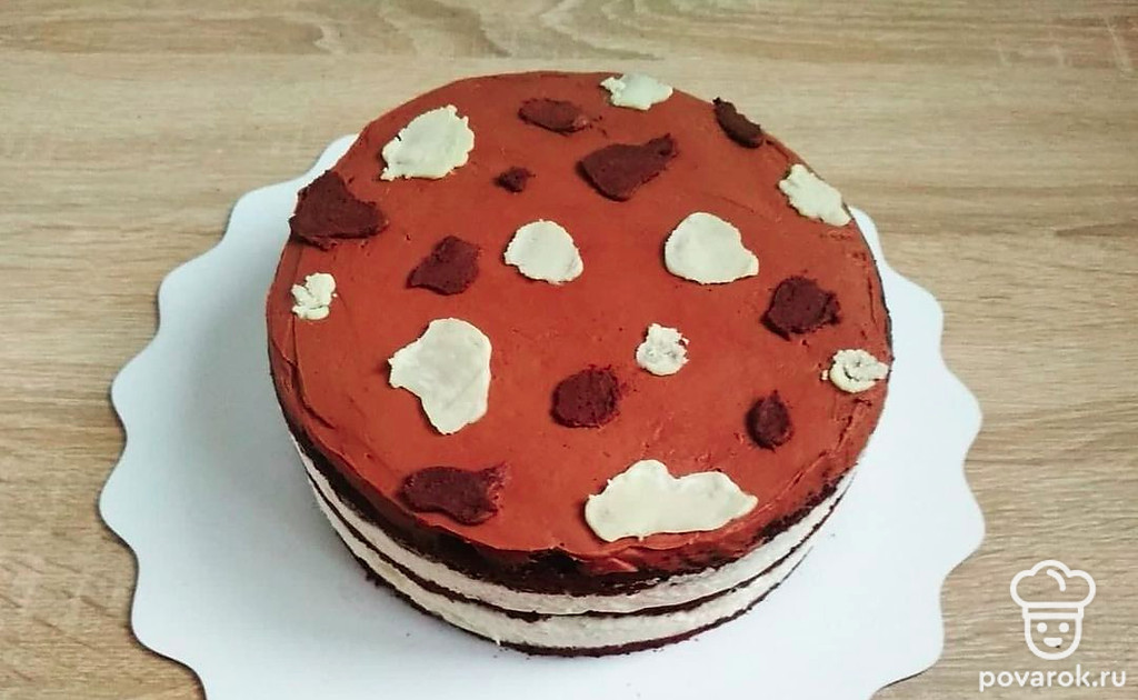 С помощью кондитерского мешка отсадите «пятна» из шоколадного ганаша на поверхность белого мусса и внутрь него. Отправьте торт в морозильную камеру, чтобы слой мусса слегка схватился. Затем накройте сверху вторым коржом и повторите то же самое – пропитка – слой белого мусса – «пятна» шоколадного ганаша – в морозилку –– следующий корж. Верхний корж пропитайте, ничем не смазывайте, накройте пищевой пленкой. Поместите торт в холодильник для пропитки и стабилизации на 6-8 часов (лучше на ночь).